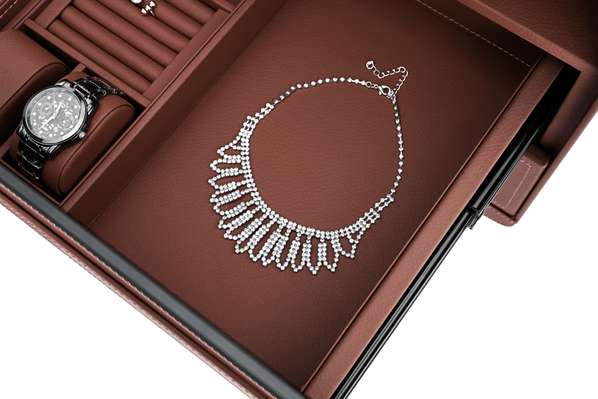 Alt bölümde yer alan ekstra deri saklama kutusu; takılarınız, belgeleriniz ve diğer değerli eşyalarınız için çizilmeye ve aşınmaya dayanıklı, özenle tasarlanmış özel bir alan sunar.